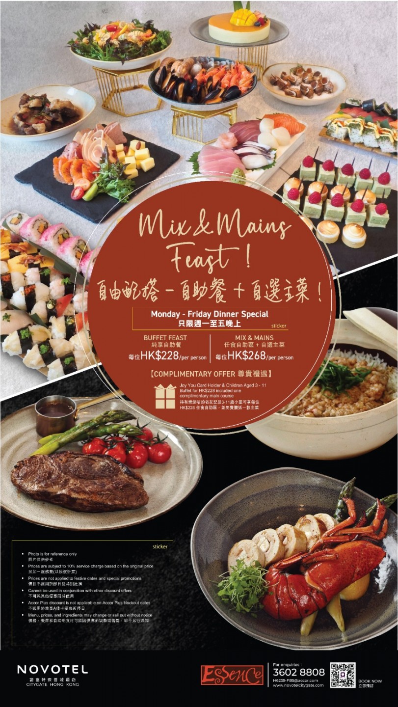 Essence offers a breakfast, lunch, and dinner buffet, along with a fusion-style Chinese and Western à la carte menu. The restaurant showcases a high ceiling design with spacious seating arrangements, creating a comfortable dining environment. The focal point of the restaurant is a buffet table adorned with three lantern-inspired light fixtures, captivating the attention of guests. The expansive open kitchen allows diners to witness the culinary artistry of the chefs from any vantage point. The buffet presents a diverse array of options, including a salad bar, Chinese noodles, Western pasta, barbecue, carved meats, sushi, seafood station, hot dishes from both Chinese and Western cuisines, and delectable desserts. The restaurant regularly introduces themed dining experiences, providing guests with fresh and enticing culinary journeys, accompanied by various discounts and promotions, ensuring a high-quality dining experience that offers excellent value for money.