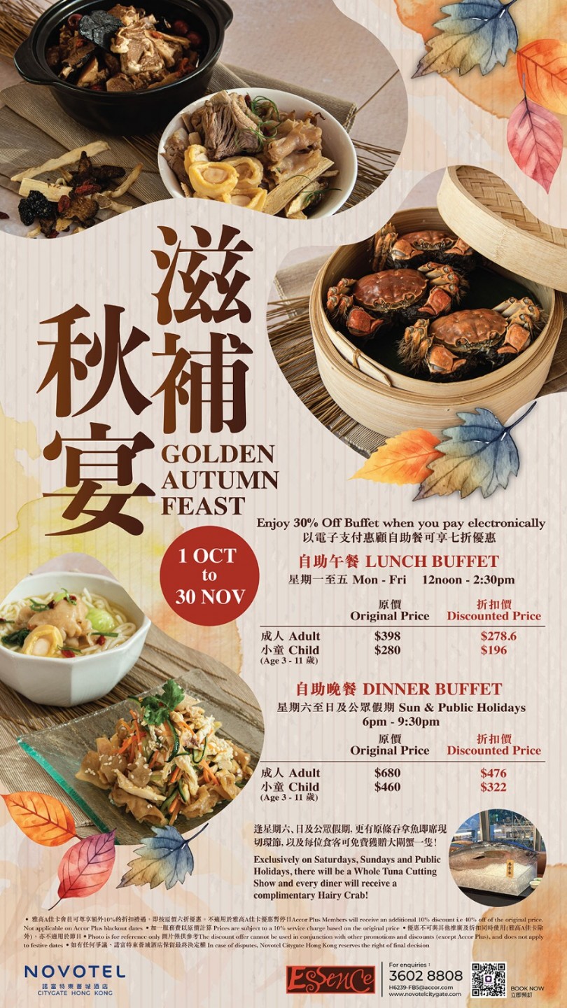 Essence 提供早餐、午餐和晚餐的自助餐,以及中西合璧的中西菜单。 餐厅设计高楼底,座位之间空间充足,提供舒适的用餐环境。 餐厅中央的自助餐桌上悬挂着三盏灯笼般的灯饰,成为整个场所的焦点。 宽敞的开放式厨房让客人坐在任何一个角落都能欣赏到厨师的烹饪艺术。 自助餐提供多种选择,包括沙律冻盘、中式粉面、西式意粉、烧烤、切肉、鱼生寿司、海鲜档、中西热盘和甜品,由不同的厨师精心制作,确保每道菜品都新鲜 美味。 餐厅更会定期推出不同主题,为食客带来新鲜感,同时提供不同的折扣和优惠,确保食客享受到最高性价比的用餐体验。