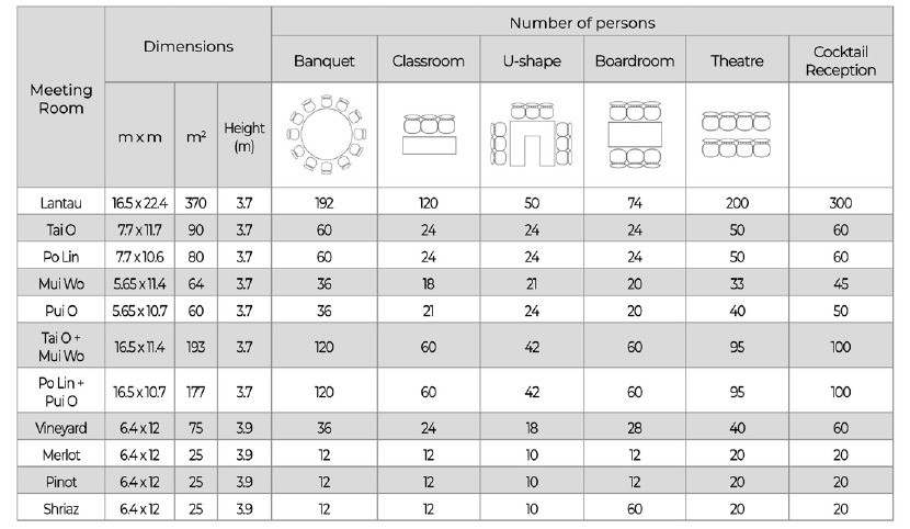 會議室擁有天然光線,遠眺群山峻嶺,連接池畔花園及日光浴平台,7間會議室可容納12至300人之宴會。