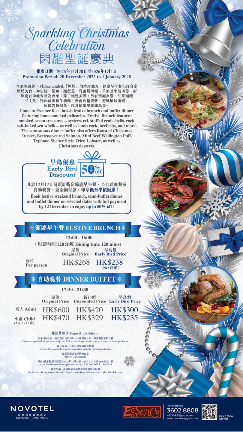 Essence 提供早餐、午餐和晚餐的自助餐,以及中西合璧的中西菜單。餐廳設計高樓底,座位之間空間充足,提供舒適的用餐環境。餐廳中央的自助餐桌上懸掛著三盞燈籠般的燈飾,成為整個場所的焦點。寬敞的開放式廚房讓客人坐在任何一個角落都能欣賞到廚師的烹飪藝術。自助餐提供多種選擇,包括沙律凍盤、中式粉麵、西式意粉、燒烤、切肉、魚生壽司、海鮮檔、中西熱盤和甜品,由不同的廚師精心製作,確保每道菜品都新鮮美味。餐廳更會定期推出不同主題,為食客帶來新鮮感,同時提供不同的折扣和優惠,確保食客享受到最高性價比的用餐體驗。