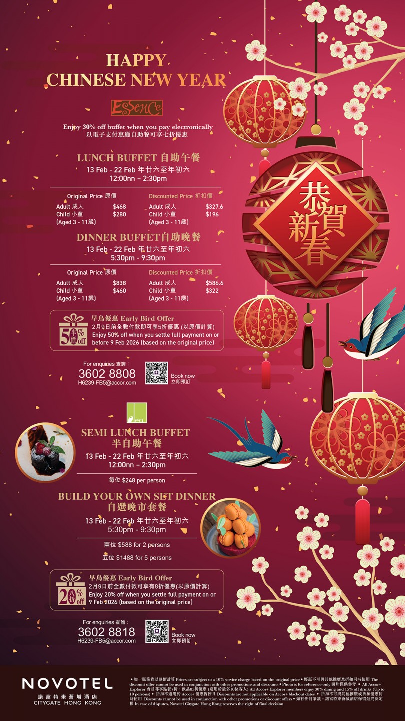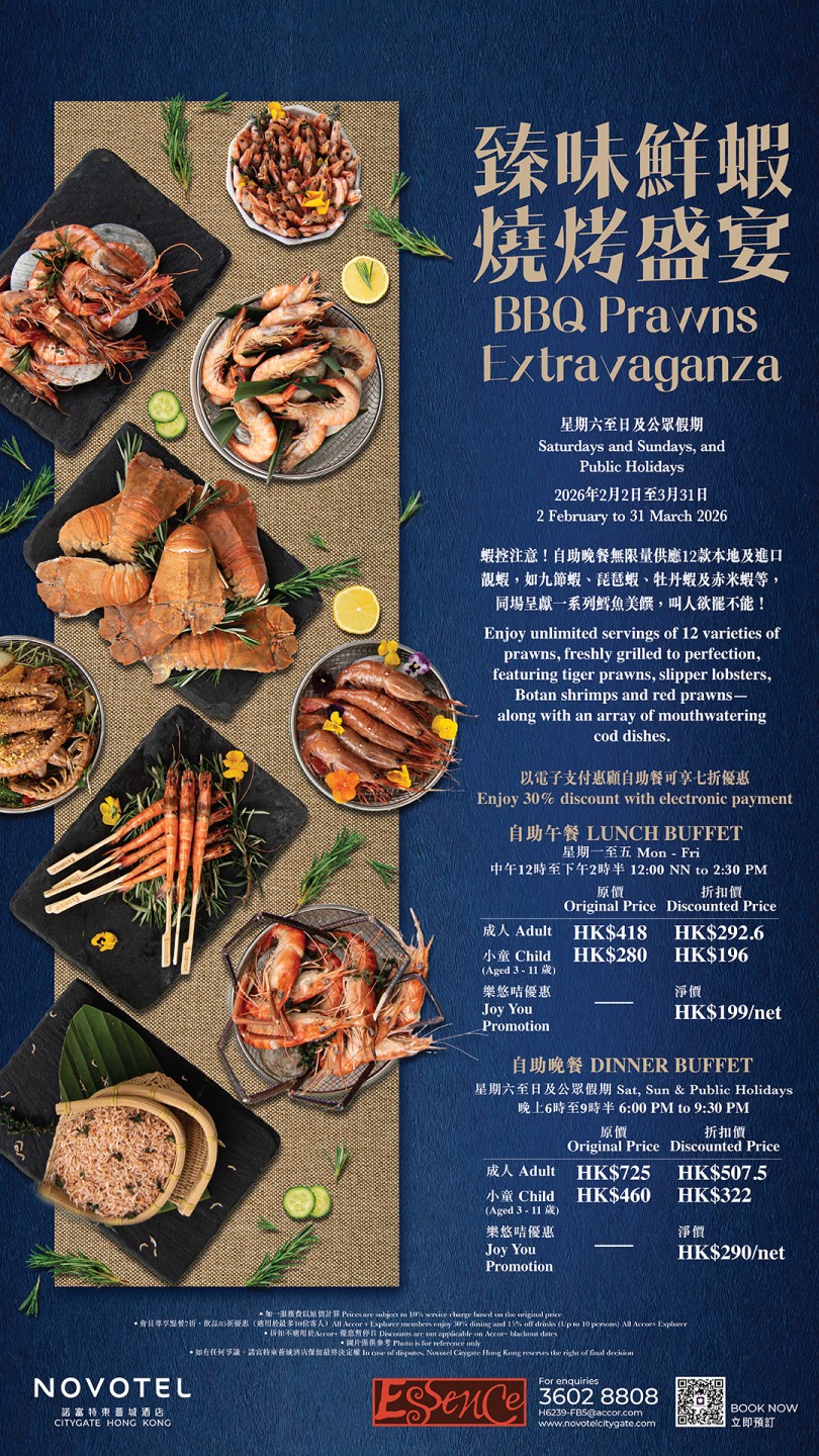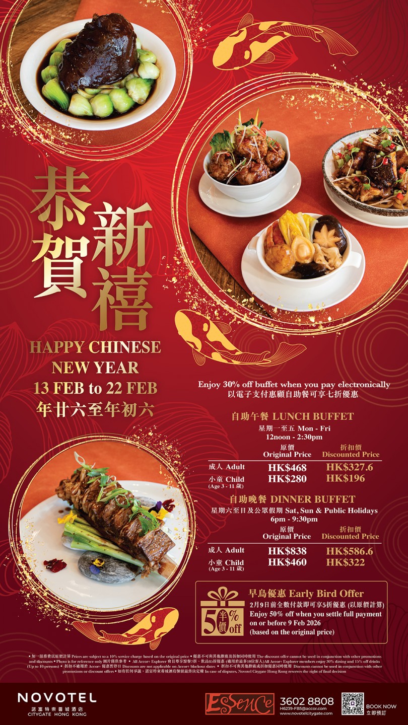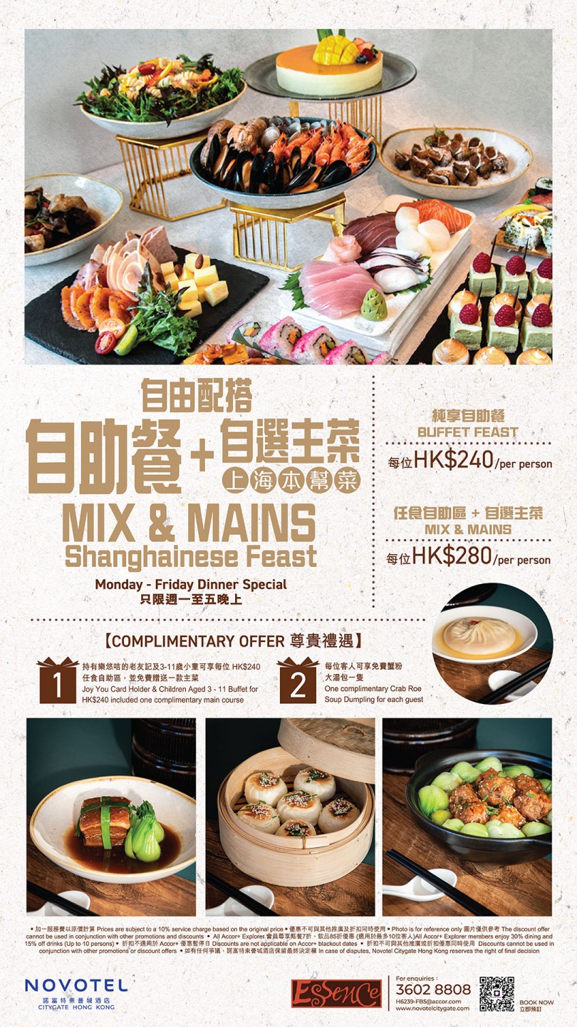 Essence 提供早餐、午餐和晚餐的自助餐,以及中西合璧的中西菜單。餐廳設計高樓底,座位之間空間充足,提供舒適的用餐環境。餐廳中央的自助餐桌上懸掛著三盞燈籠般的燈飾,成為整個場所的焦點。寬敞的開放式廚房讓客人坐在任何一個角落都能欣賞到廚師的烹飪藝術。自助餐提供多種選擇,包括沙律凍盤、中式粉麵、西式意粉、燒烤、切肉、魚生壽司、海鮮檔、中西熱盤和甜品,由不同的廚師精心製作,確保每道菜品都新鮮美味。餐廳更會定期推出不同主題,為食客帶來新鮮感,同時提供不同的折扣和優惠,確保食客享受到最高性價比的用餐體驗。